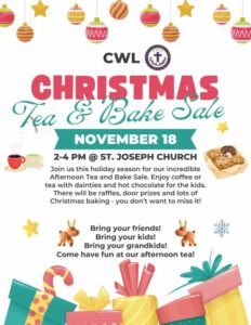 Afternoon Tea served from 2-4pm in Tranquille Hall. Donations of baking would be 17appreciated. Bring your contributions between 6 & 8 pm on Friday Nov. 17 or Saturday morning , 9-11 am.