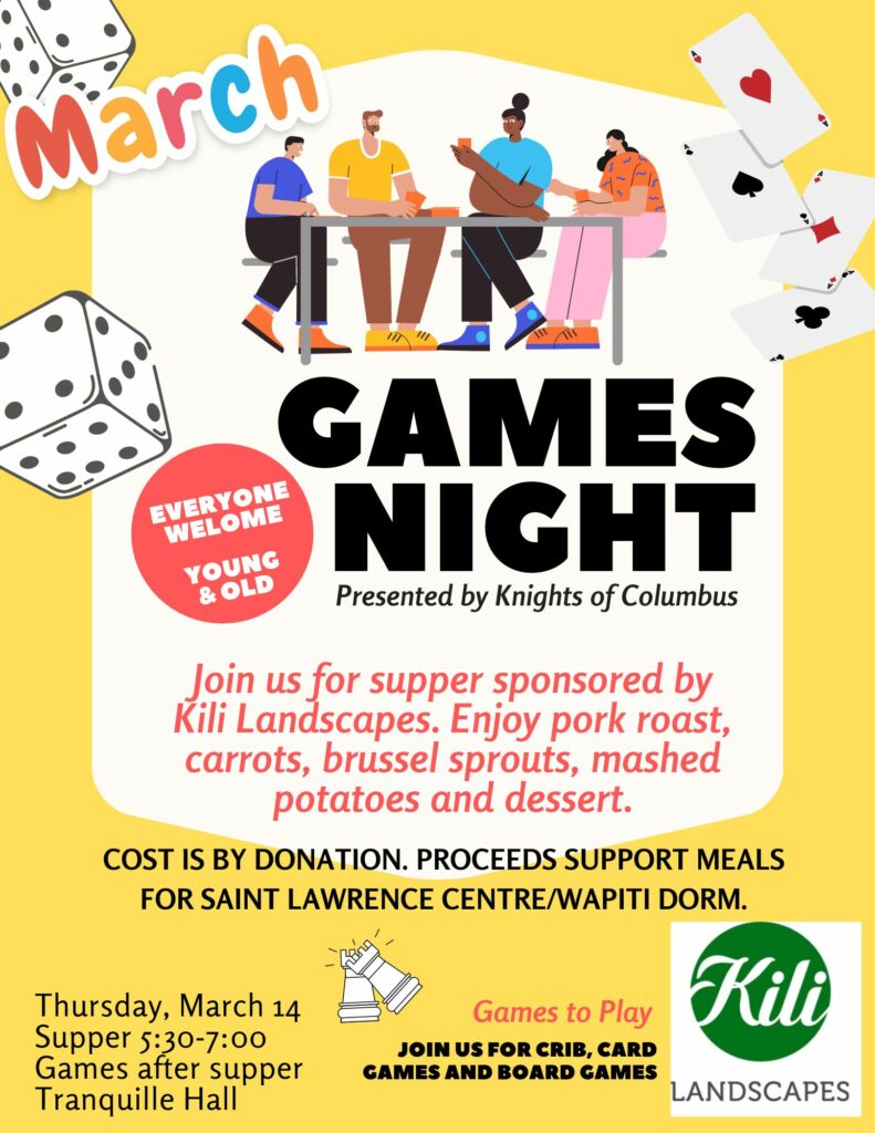 March 14th games night is sponsored by Kili Landscaping. Pork Roast, carrots, mashed potatoes, brussel sprouts and cookies for dessert. Doors open 530, games start around 7 or earlier if they want. Donations accepted with proceeds going to cooking for St. Lawrence.