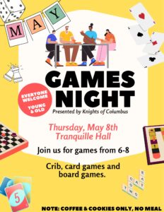 Games Night presented by the Knights of Columbus is an evening of food, fellowship and fun. From crib tournaments and cards to board games, there is fun for the whole family!