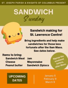 Gather in Tranquille Hall after 9 am or 11am mass to make sandwiches for the St. Lawrence Centre. Parishioners are invited to drop off supplies for making sandwiches for the hungry, and/or join in making the sandwiches after the Sunday masses.