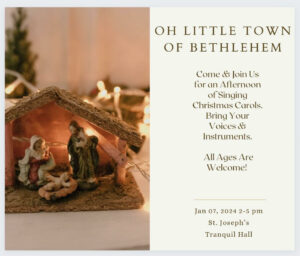 Join us for Christmas Carols in Tranquille hall from 2-5pm. All ages welcome, enjoy  cookies and tea. Bring your voices and your instruments to sing Christmas carols together.