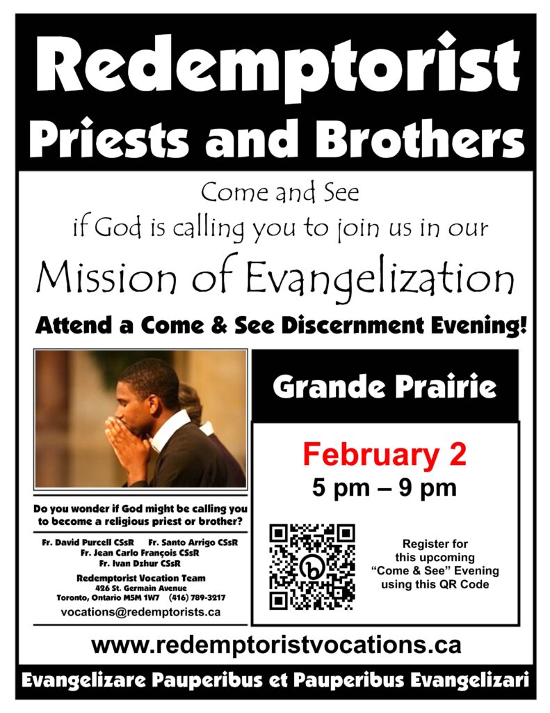 Do you wonder if God might be calling you to become a religious priest or brother? Come and see if God is calling you to join us in our Mission of Evangelization. Join Fr. Charles, Fr. Ed, Fr. Joseph, and other Redemptorist priests on February 2nd from 5pm-9pm. An evening with food, questions, discerning, and community. Men all ages welcome.