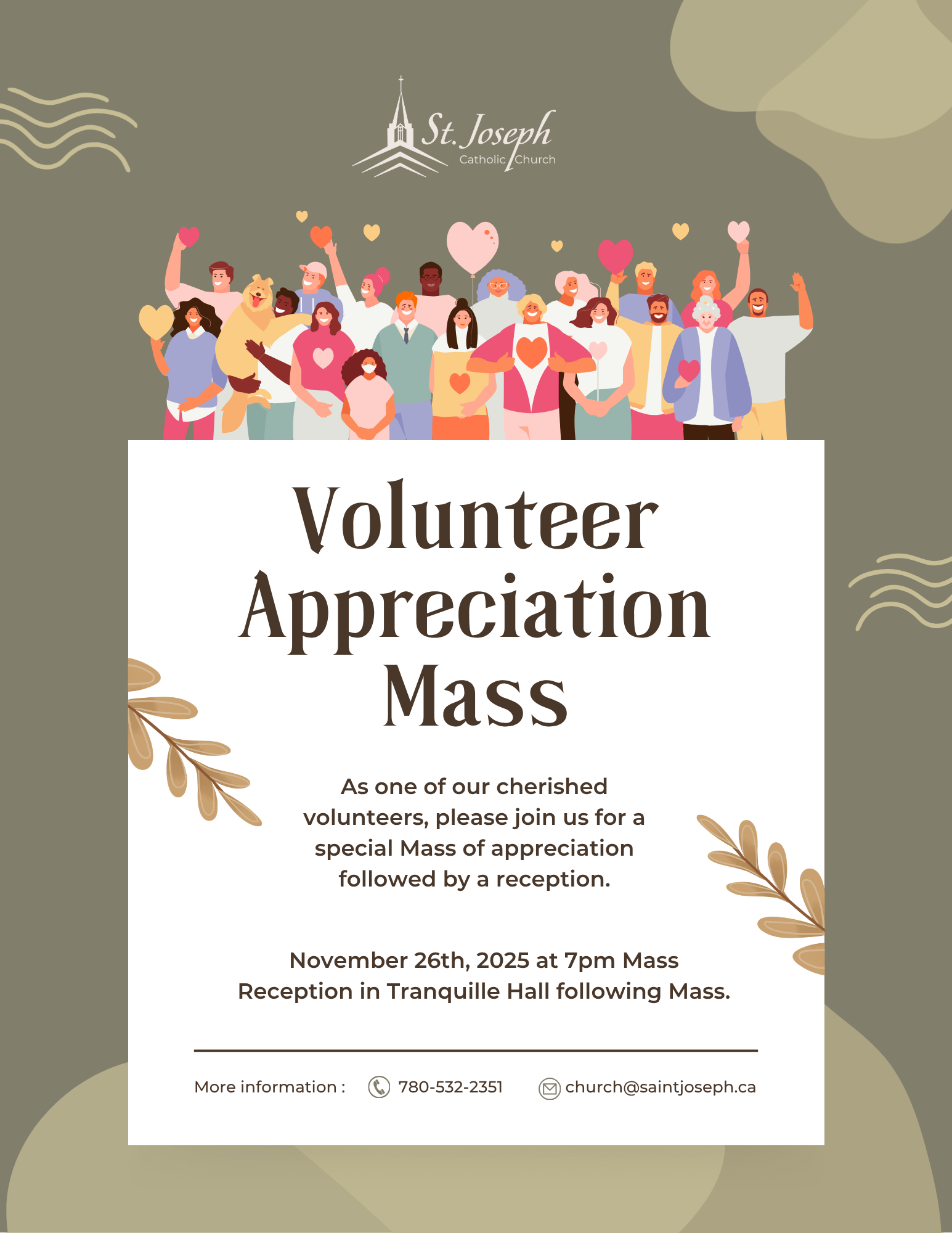 As one of our cherished volunteers, please join us for a special Mass of appreciation followed by a reception.