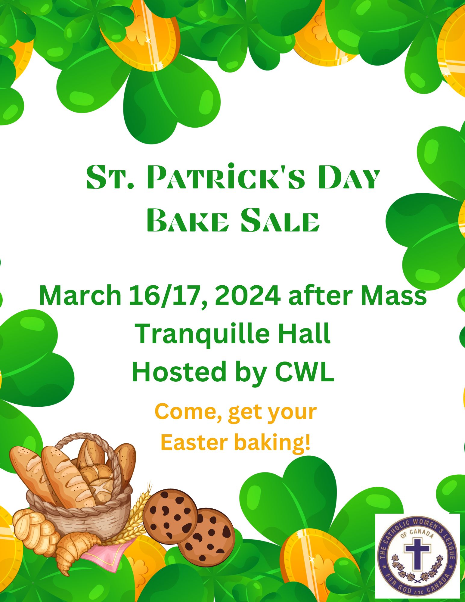 Tranquille Hall Grande PrairieCWL Bake Sale - March 16/17 after Mass in Tranquille Hall.